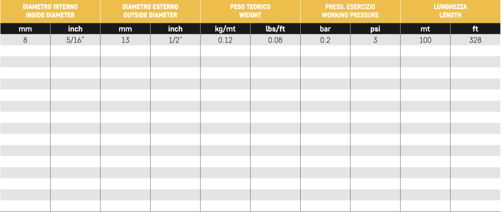 Tube: black, smooth GPL gas resistant PVC Reinforcement: high strength synthetic textile yarn Cover: blue PVC, abrasion and weathering resistant Surface: smooth extruded Marking: ink marking “8 - IEMMEQU - UNI 7140 : 2019 - to be replaced by…”